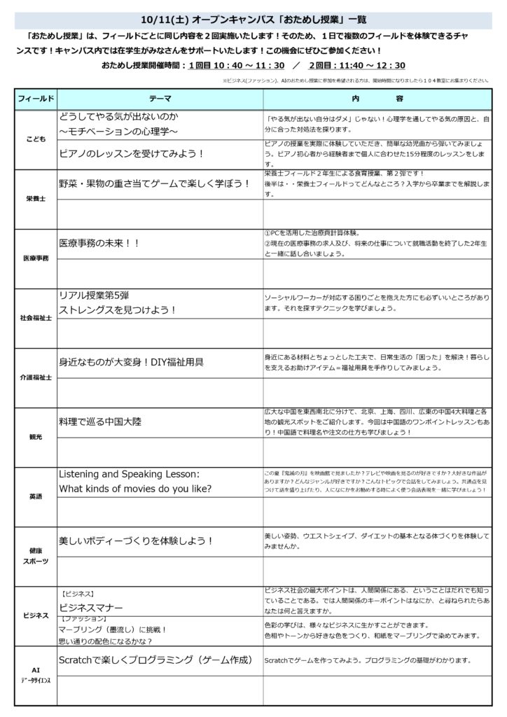 【オープンキャンパス2025】10/11(土)「おためし授業」企画内容 お知らせ イベント 2025.9.23 10/11(土)オープンキャンパス「おためし授業」一覧です。各フィールドの特徴がつまった内容を用意していますので、この機会にぜひご参加ください!みなさんのお越しをお待ちしています! おためし授業1回目:10:40 ~ 11:30おためし授業2回目:11:40 ~ 12:30 ※おためし授業1~2回目は、同じ内容が繰り返し実施されますので、ご都合の良い時間帯にご参加ください。 お知らせ一覧に戻る