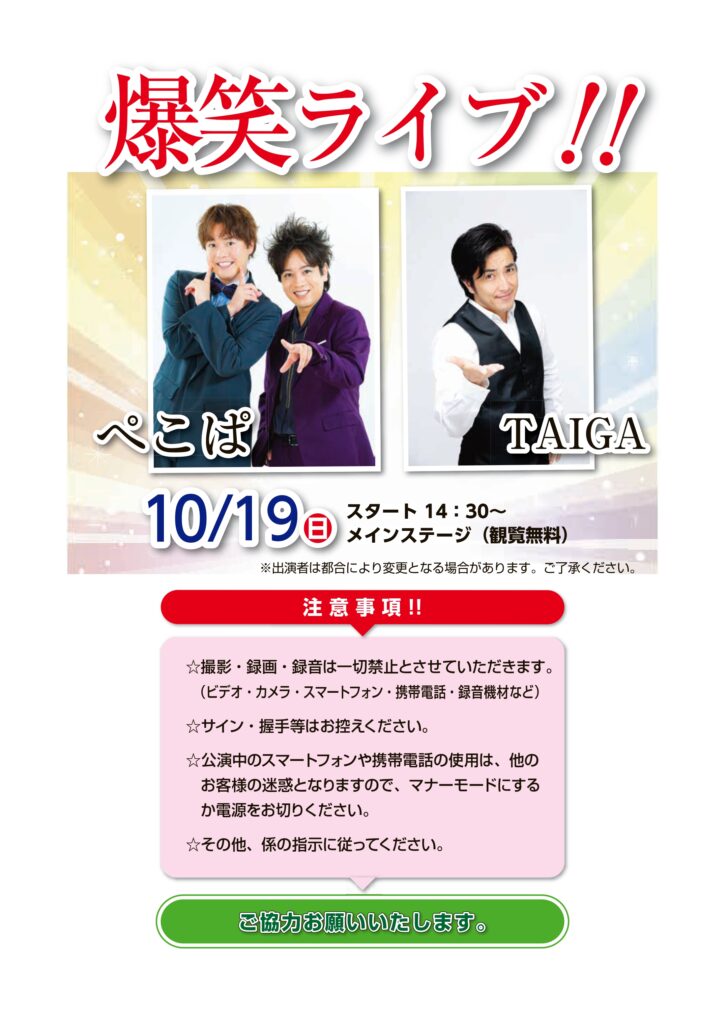 さらに、大人気お笑い芸人「ぺこぱ」と「TAIGA」による爆笑お笑いライブも開催予定です!