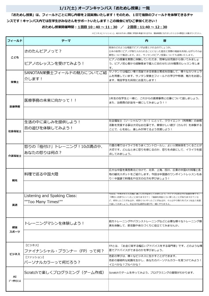 【オープンキャンパス2025】1/17(土)「おためし授業」企画内容 お知らせ イベント 2025.12.25 1/17(土)オープンキャンパス「おためし授業」一覧です。各フィールドの特徴がつまった内容を用意していますので、この機会にぜひご参加ください!みなさんのお越しをお待ちしています! おためし授業1回目:10:40 ~ 11:30おためし授業2回目:11:40 ~ 12:30 ※おためし授業1~2回目は、同じ内容が繰り返し実施されますので、ご都合の良い時間帯にご参加ください。 お知らせ一覧に戻る