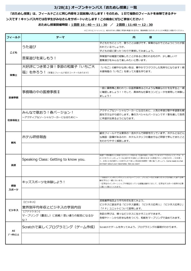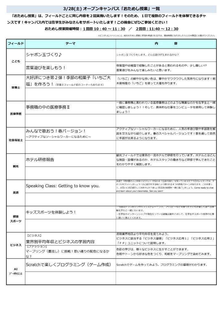【オープンキャンパス2026】3/20(金祝)、28(土)「おためし授業」企画内容 お知らせ イベント 2026.3.9 3/20(金祝)、28(土)オープンキャンパス「おためし授業」一覧です。各フィールドの特徴がつまった内容を用意していますので、この機会にぜひご参加ください!みなさんのお越しをお待ちしています! おためし授業1回目:10:40 ~ 11:30おためし授業2回目:11:40 ~ 12:30 ※おためし授業1~2回目は、同じ内容が繰り返し実施されますので、ご都合の良い時間帯にご参加ください。 お知らせ一覧に戻る