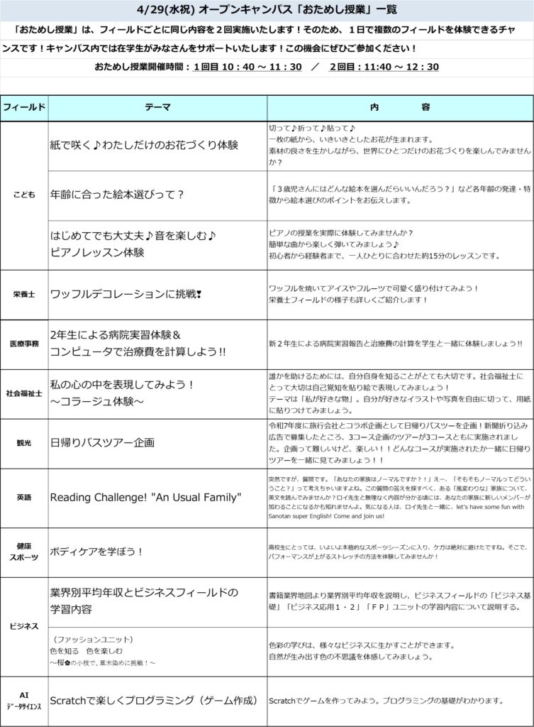 【オープンキャンパス2027】4/29(水祝)「おためし授業」企画内容 お知らせ イベント 2026.4.10 4/29(水祝)オープンキャンパス「おためし授業」一覧です。各フィールドの特徴がつまった内容を用意していますので、この機会にぜひご参加ください!みなさんのお越しをお待ちしています! おためし授業1回目:10:40 ~ 11:30おためし授業2回目:11:40 ~ 12:30 ※おためし授業1~2回目は、同じ内容が繰り返し実施されますので、 ご都合の良い時間帯にご参加ください。 お知らせ一覧に戻る